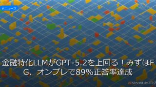 ニュース 金融特化LLMがGPT-5.2を上回る!みずほFG、オンプレで89%正答率達成 みずほFGが開発した金融特化LLMがGPT-5.2を上回る89%正答率を達成!オンプレ環境で1秒未満の応答時間。金融機関のセキュリティと効率性を革新。詳しくはこちら→ 2026.03.08 ニュース