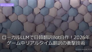 ローカルLLM ローカルLLMで日韓翻訳Bot自作!2026年ゲーム中リアルタイム翻訳の衝撃技術 ローカルLLMで日韓翻訳Botを自作し、ゲーム中のリアルタイム翻訳を実現!3つの機能を統合した開発プロセスを解説。今すぐチェック! 2026.03.18 ローカルLLM