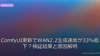 画像生成AI ComfyUI更新でWAN2.2生成速度が33%低下?検証結果と原因解明 ComfyUIの最新アップデートでWAN2.2の生成速度が33%低下?Redditユーザーの検証結果と原因を解明。クリエイター必見の最新レポートをチェック! 2026.03.10 画像生成AI