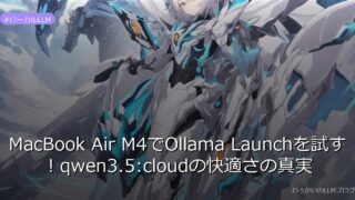 ローカルLLM MacBook Air M4でOllama Launchを試す!qwen3.5:cloudの快適さの真実 MacBook Air M4(24GB)で「Ollama Launch」を実際に検証。期待はずれの遅延と、クラウドAPIのqwen3.5:cloudの圧倒的快適さの真実を暴露。ローカルLLMの現実とハイブリッド環境の選択基準を詳しく解説します。 2026.04.07 ローカルLLM