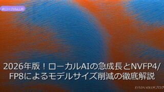 ローカルLLM 2026年版!ローカルAIの急成長とNVFP4/FP8によるモデルサイズ削減の徹底解説 ローカルAIが急成長!NVFP4/FP8でモデルサイズ削減と高性能を実現。PCユーザー向けにVRAM使用量87GB→26GB、6倍の高速化を達成。詳しくはこちら 2026.01.27 ローカルLLM